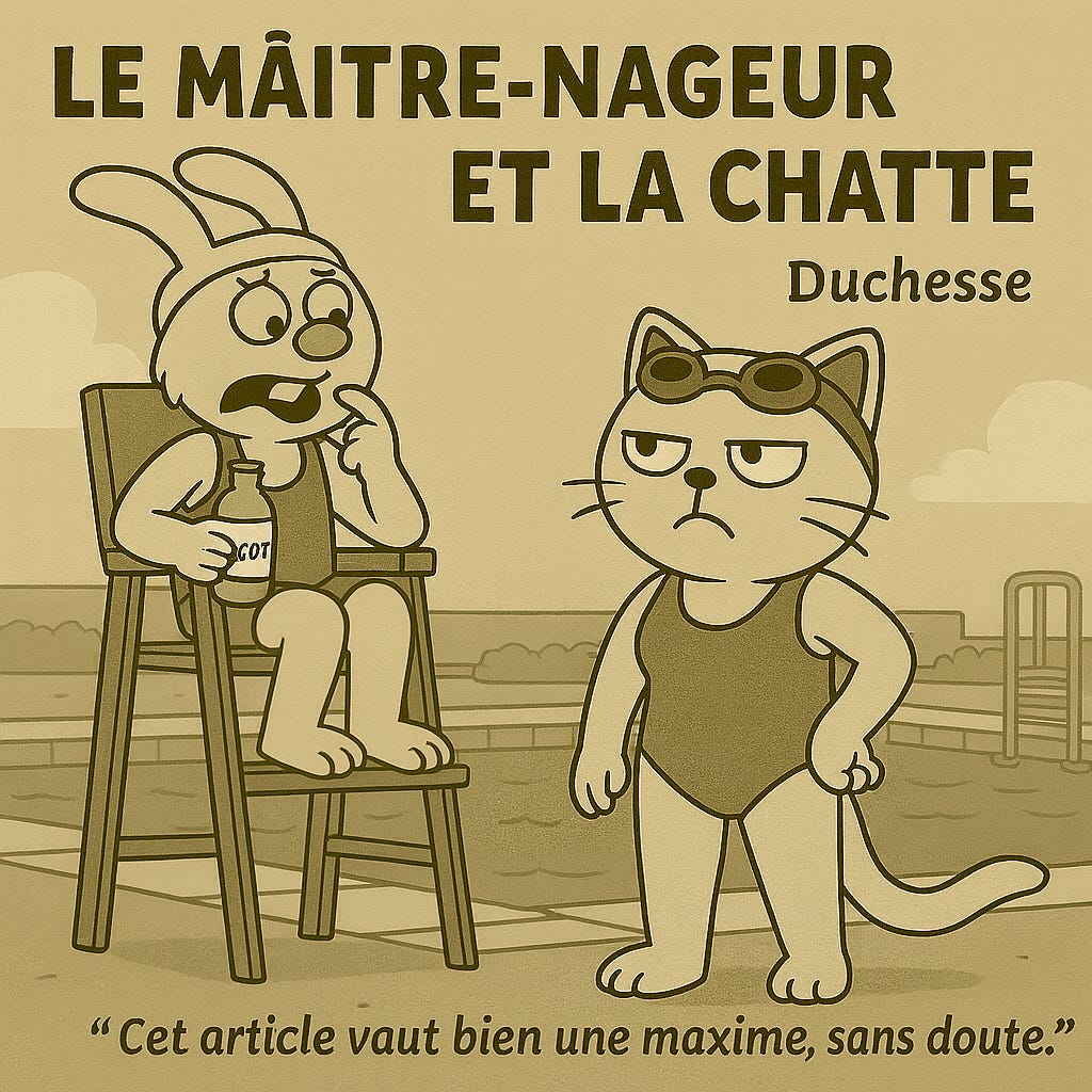 Cet article vaut bien une maxime, sans doute. »Le Maître-nageur, honteux et confus,