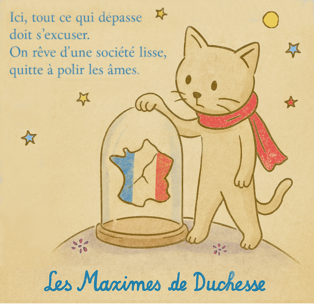 — Duchesse, griffes affûtées dans une patte de velours. Qui sait que l’hypocrisie nationale n’est qu’une forme raffinée de désespoir.